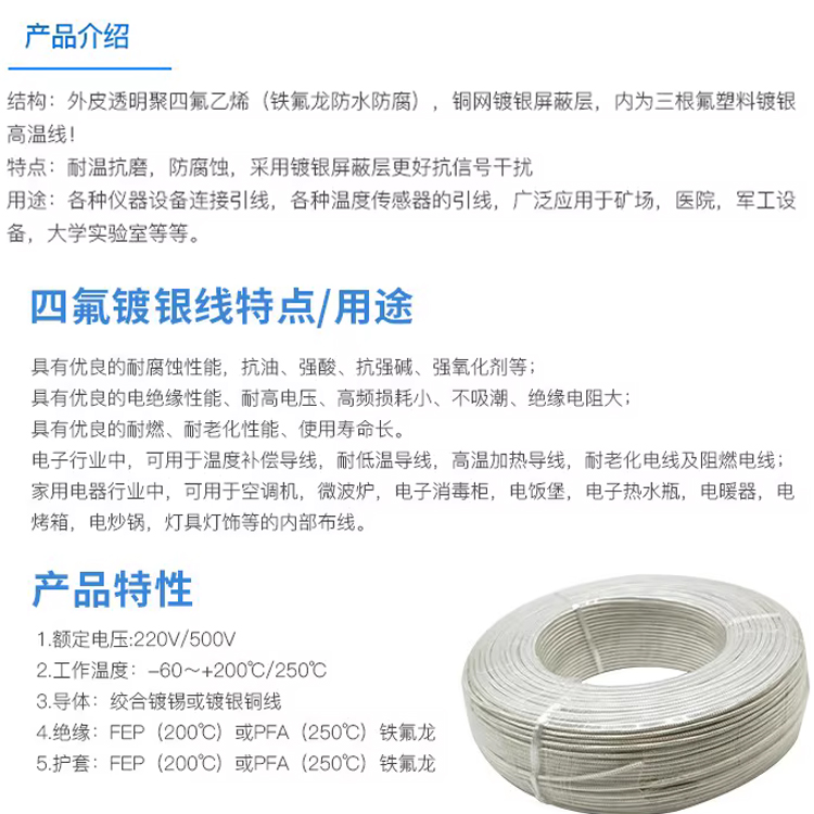 三芯四氟镀银屏蔽线: