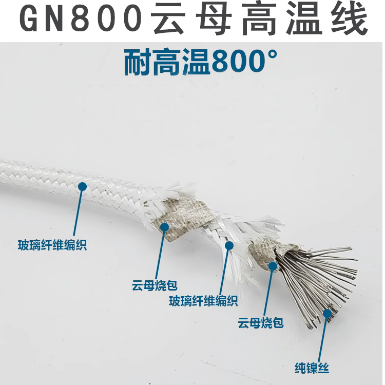 采用纯镍丝制作,内层耐高温云母绕包,中间玻璃纤维编织绝缘,再耐高温云母带绕包,外层玻璃纤维保护绝缘。耐高温可达800℃。
