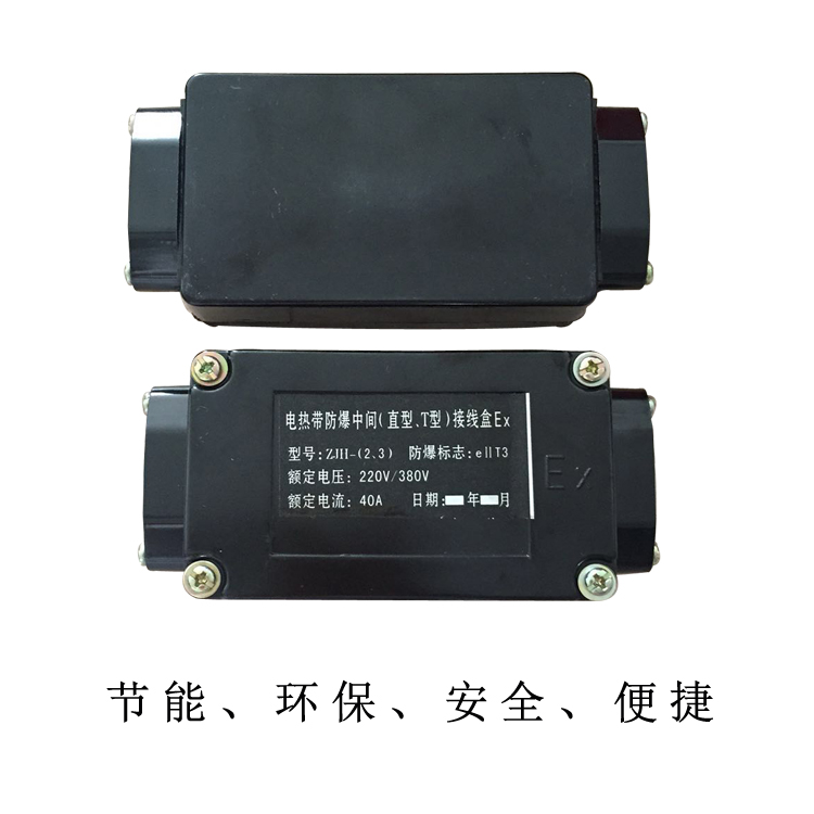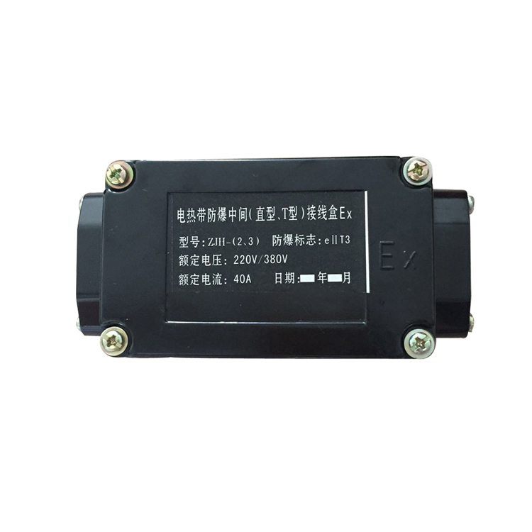 用于防爆区域电伴热带与电伴热带的连接,增加电伴热带的长度或用在同一管线上配用不同功率的电伴热带及三叉管线等较复杂的场合。其外壳为高强度塑料(DMC或胶木材质)。 与电伴热带配套后适用于工厂一区、二区爆炸性气体T3、T4组场所使用。