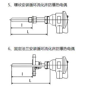 注2:循环流化床热电偶如选用固定法兰或螺纹安装方式,用户订货时必须标注法兰标准/法兰规格/法兰材质或螺纹尺寸/螺纹材质要求。